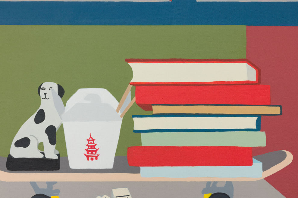 Catalina Jaramillo Quijano creates visual narratives where objects, familiar or not, that have populated or still populate one’s interior, are protagonists. Inspired by the so-called ‘chaekgeori’ (“books and things”), a genre of 18th-century Korean decorative painting, commissioned by the aristocracy to reflect their personality or invent a new idealized identity, each of her shelf paintings is itself a small collection, where series of objects appear and begin to dialogue with the viewer and weave an entirely personal story. Titled after Francis Ponge’s collection of poems, ‘Le parti pris des choses’, where he describes and reflects upon the beauty of everyday elements, each chosen for their extreme banality, often forgotten in their use, this series of paintings represents a continuation of the artist's interest in research and writing represented through books and libraries. Her pictorial language reduces the objects to their most basic forms, choosing to capture things from their smallest characteristics, blocks of colour and geometric shapes, an alternative language to writing. Jaramillo’s work invites us to reflect on the spaces we inhabit every day and to question how we inhabit our homes and how our anonymous objects speak of our history.